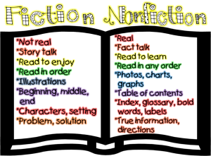 我很喜欢下面的这个小海报,将虚构类和非虚构类做了清晰的对比。简单来说,虚构类故事是不真实的,用讲故事的方式,来娱乐读者。故事里面的情节大概都是遵循着一定的顺序,故事中有着人物、环境、故事冲突和解决问题的办法。
