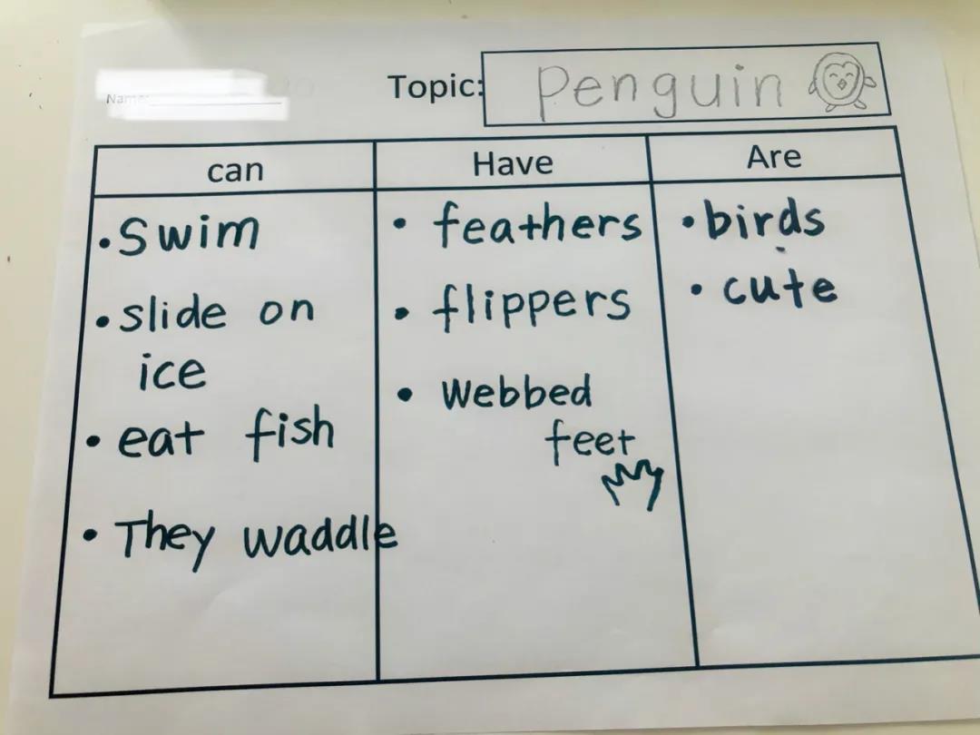 我决定给孩子们先做个示范,在读了一本关于“企鹅”的书之后,我用到了下面的can have are图表,让小朋友将书中的重要信息提炼出来: