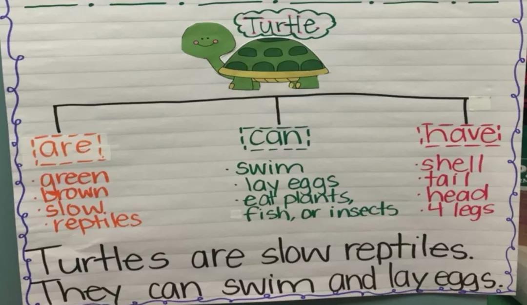 除此之外,这款图表对于孩子的写作也非常有帮助。我们先让小朋友用Can Have Are图表,写下自己对于乌龟的认识。