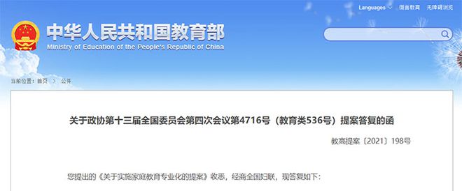 近日,教育部网站发布对《关于实施家庭教育专业化的提案》的答复。答复中表示,教育部将继续支持有条件的高校加强家庭教育相关学科专业和课程建设,促进优质课程资源共享,培养更多高素质家庭教育相关专业人才。