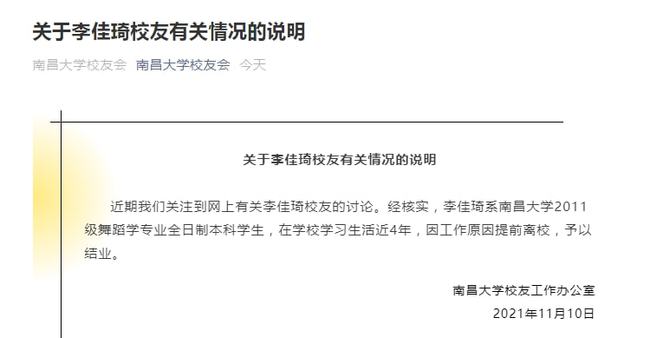 11月10日,南昌大学校友工作办公室发布关于李佳琦校友有关情况的说明,以下为全文: