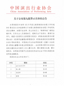 今年以来,中宣部、中央网信办、文化和旅游部相继开展网络生态治理,饭圈治理,文娱领域综合治理工作,在此背景下,部分网络主播仍然我行我素,漠视规则,挑战监管,对于这些行为,行业坚决予以抵制。根据相关通知要求和会议精神,中国演出行业协会网络表演(直播)分会为防止劣迹艺人“转移阵地”继续出镜牟利,引导从业人员崇德尚艺、遏制行业不良倾向,廓清行业风气,按照《网络主播警示和复出管理规范》组织内容评议委员会专家组进行审核,并经会长联席会讨论通过,确定出第九批网络表演(直播)行业主播“警示名单”(共计88名)。
