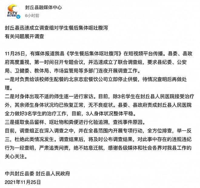 11月26日凌晨,@封丘县融媒体中心 微博就学生餐后集体呕吐腹泻作出回应,全文如下: