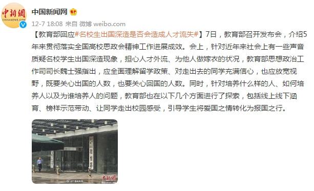 7日,教育部召开发布会,介绍5年来贯彻落实全国高校思政会精神工作进展成效。会上,针对近年来社会上有一些声音质疑名校学生出国深造现象,担心人才外流、为他人做嫁衣的状况,教育部思想政治工作司司长魏士强指出,应全面理解留学政策、对走出去的同学充满信心,也应放宽视野,既要关心出国的人数,也要关心回国的人数。同时,针对培养什么样的人、如何培养人以及为谁培养人的问题,教育部也在以下几个方面进行了探索,包括线上线下涵育、榜样示范带动、让同学走出校园感受,引导学生将爱国之情转化为报国之行。