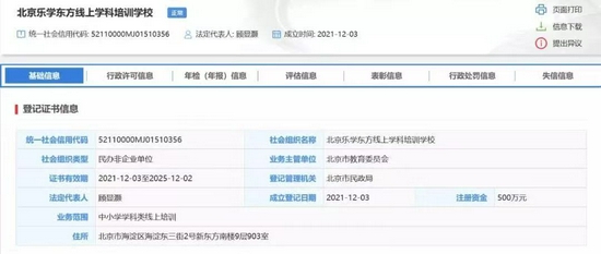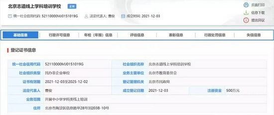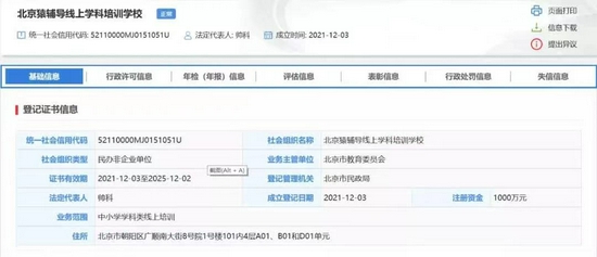 根据全国社会组织信用信息公示平台的相关资料,上述5家组织的成立时间皆为2021年12月3日。北京希望在线线上学科培训学校、北京志道线上学科培训学校、北京作业帮线上学科培训学校、北京乐学东方线上学科培训学校等4家机构注册资金为500万元,北京猿辅导线上学科培训学校注册资金为1000万元。